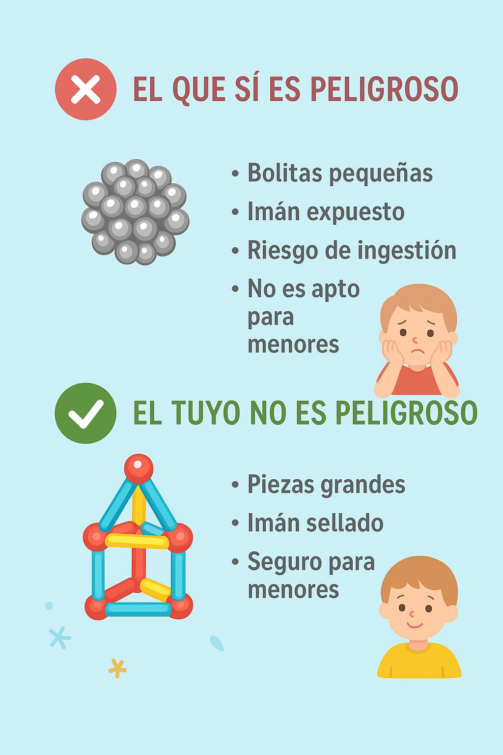 Nuestros bloques magnéticos están diseñados con piezas grandes y un imán sellado internamente, lo que evita cualquier riesgo de ingesta o exposición. Este set NO utiliza bolitas magnéticas pequeñas (las que sí son peligrosas).